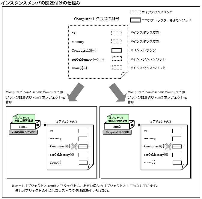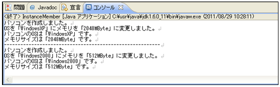[java] package jp.co.f1.basic.ch06; class Computer1 { private String os; // インスタンス変数 private int memory; // インスタンス変数 public Computer1() { // コンストラクタ this.os = null; this.memory = 0; System.out.println(“パソコンを作成しました。”); } public void setOsMemory(String os, int memory) { // インスタンスメソッド this.os = os; this.memory = memory; System.out.println(“OSを「” + os + “」にメモリを「” + memory + “MByte」に変更しました。”); } public void show() { // インスタンスメソッド System.out.println(“パソコンのOSは「” + os + “」です。”); System.out.println(“メモリサイズは「” + memory + “MByte」です。”); } } public class InstanceMember { public static void main(String[] args) { Computer1 com1 = new Computer1(); // com1オブジェクト作成(インスタンス作成) com1.setOsMemory(“WindowsXP”, 2048); // com1オブジェクトのsetOsMemoryメソッド呼び出し com1.show(); // com1オブジェクトのshowメソッド呼び出し System.out.println(“———————————————————“); Computer1 com2 = new Computer1(); // com2オブジェクト作成(インスタンス作成) com2.setOsMemory(“Windows2000”, 512); // com2オブジェクトのsetOsMemoryメソッド呼び出し com2.show(); // com2オブジェクトのshowメソッド呼び出し } } [/java] 実行結果① ソース・フォルダー: myproj_basic/src