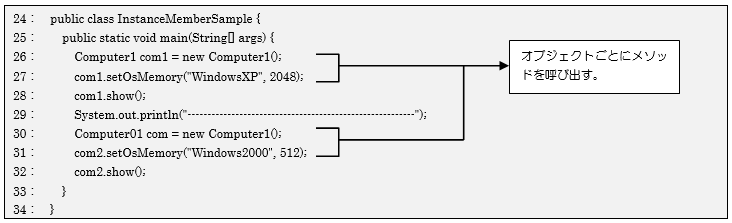 24行~34行の「InstanceMember」クラスで定義しているmainメソッド内で「Computer1」クラスを2つ生成しています。26、30行目でオブジェクトを2つ生成することにより、個々のオブジェクト(com1、com2)のインスタンスメソッドを呼び出すことができます。