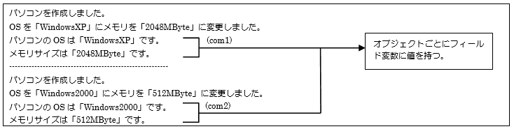 上記の図のようにオブジェクトを生成することで、インスタンスメンバも同時に生成されます。これによりメソッドを利用してそれぞれのオブジェクトの「os」や「memory」に値を代入したり、出力したりすることができました。OSやメモリといった値がそれぞれのパソコンに設定されているように、各Computer1オブジェクトのフィールドへ値を格納することができたのです。