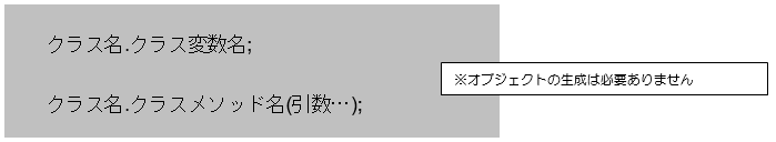 ② クラスメソッドへはオブジェクトを生成せずに「クラス名.メソッド名」で直接アクセスします。