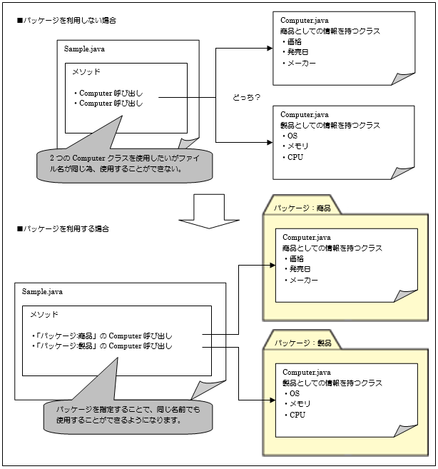 大規模なプログラムを開発していくと、他のプログラマーが既に作成済みのクラスを利用していく場合があります。そのときに作成したクラスが作成済みのクラスと名前が同じである場合があり、プログラムの中で混在させて使わなければならない時もあります。このときに、Javaではパッケージ(package)という仕組みにより、同じ名前であっても自身で作成したクラスと他者の作成したクラスを区別し使用することができます。