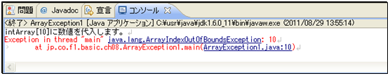 [java] package jp.co.f1.basic.ch08; public class ArrayException1 { public static void main(String[] args) { // int型配列を定義 int[] intArray = new int[5]; // 添え字10に値を代入 System.out.println(“intArray[10]に数値を代入します。”); intArray[10] = 50; // 最大配列要素数を超えた代入処理 // 結果を表示 System.out.println(“intArray[10]に50を代入しました。”); System.out.println(“処理終了”); } } [/java] 実行結果① ソース・フォルダー: myproj_basic/src