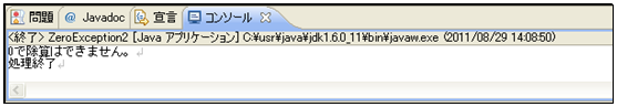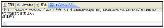 [java] package jp.co.f1.basic.ch08; public class ZeroException2 { public static void main(String[] args) { try { // 数値を0で除算します。 int num = 10 / 0; // 結果を表示 System.out.println(“10/0の結果は” + num); } catch (ArithmeticException e) { // 0除算の例外処理 System.out.println(“0で除算はできません。”); } System.out.println(“処理終了”); } } [/java] 実行結果① ソース・フォルダー: myproj_basic/src