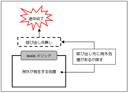 本章でこれまで紹介したプログラムではmainメソッドで例外が発生していました。結果それ以上呼び出し元のメソッドに戻ることができず、例外処理を行わなかった場合はプログラムが途中で終了していた理由になります。