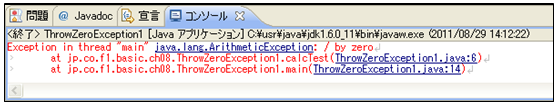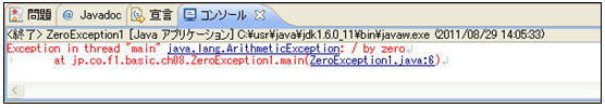 [java] package jp.co.f1.basic.ch08; public class ThrowZeroException1 { static public void calcTest() { // 数値を0で除算します。 int num = 10 / 0; // 結果を表示 System.out.println(“10/0の結果は” + num); } public static void main(String[] args) { // calcTestメソッド呼び出し calcTest(); System.out.println(“処理終了”); } } [/java]① ソース・フォルダー: myproj_basic/src