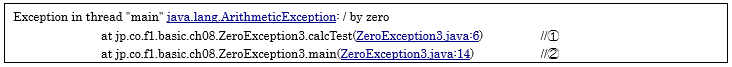 [java] package jp.co.f1.basic.ch08; public class ThrowZeroException2 { public static void calcTest() { // 数値を0で除算します。 int num = 10 / 0; // 結果を表示 System.out.println(“10/0の結果は” + num); } public static void main(String[] args) { try { // calcTestメソッド呼び出し calcTest(); } catch (ArithmeticException e) { // 0除算の例外処理 System.out.println(“0で除算はできません。”); } System.out.println(“処理終了”); } } [/java]① ソース・フォルダー: myproj_basic/src