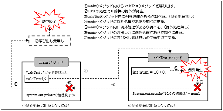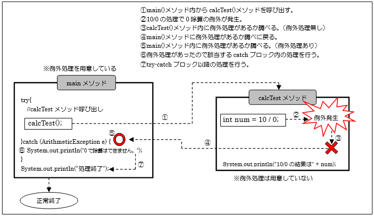calcTestメソッド内には特に例外処理は追加していませんが、mainメソッド内でtry~catch文を記述しています。これによりcalcTest()メソッド内で例外が発生してもmain()メソッドで例外を処理することができます。