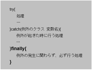 - 例外処理にfinallyブロックをつけると、例外の有無に関わらず必ず処理を行ってくれる。(※省略も可能)