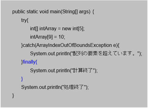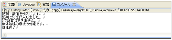 [java] }finally{ System.out.println(“例外処理の最後の処理です。”); } [/java]では次の項でcatchブロックを複数使ったプログラムを紹介します。