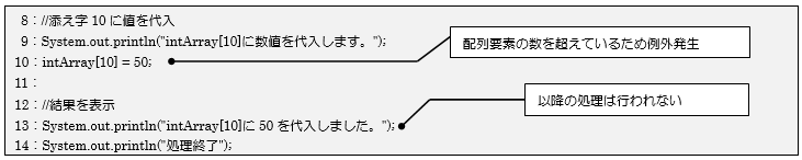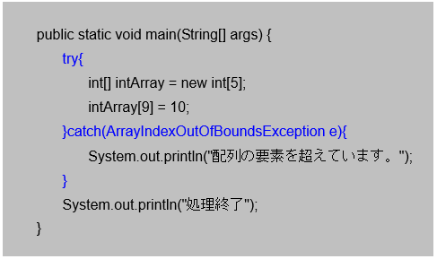 [java] intArray[10] = 50; //最大配列要素数を越えた代入処理 [/java]続いて15行目~17行目にてtryブロック内で発生する、例外の種類ArrayIndexOutOfBoundsExceptionを指定してcatchブロックを設定しています。この記述により11行目で発生した例外を処理できるようになり、処理を途中で中断する代わりに16行目の処理を行い画面にメッセージを出力します。