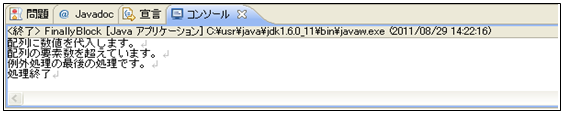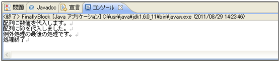 [java] package jp.co.f1.basic.ch08; public class FinallyBlock { public static void main(String[] args) { try { // int型配列を定義 int[] intArray = new int[5]; // 配列に値を代入 System.out.println(“配列に数値を代入します。”); intArray[10] = 50; // 例外をわざと発生させる代入 // intArray[0] = 50; //正しく代入する // 結果を表示 System.out.println(“配列に50を代入しました。”); } catch (ArrayIndexOutOfBoundsException e) { // 最大配列要素数を超えた例外処理 System.out.println(“配列の要素数を超えています。”); } finally { System.out.println(“例外処理の最後の処理です。”); // finallyブロック } System.out.println(“処理終了”); } } [/java]① ソース・フォルダー: myproj_basic/src