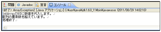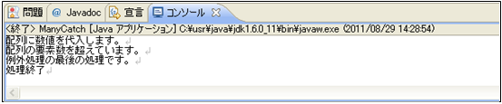[java] }catch(ArrayIndexOutOfBoundsException e){ //最大配列要素を超えた例外処理 System.out.println(“配列の要素数を超えています。”); } [/java]try~catchブロックの後から処理が再開し、18行目のメッセージを出力していることが確認できます。