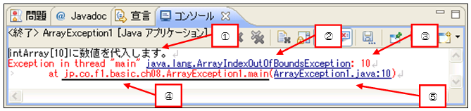 ④ 例外発生ファイル:jp.co.f1.basic.ch08.ArrayException1.main(パッケージ+クラス名+メソッド名)