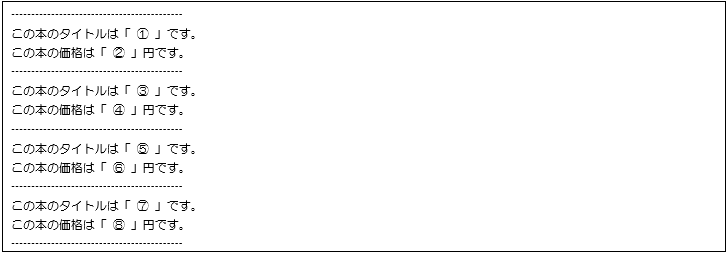 [java] package jp.co.f1.basic.ch09exercise; public class Books { private String title; //タイトル private int price; //価格 //コンストラクタ public Books(String title,int price){ this.title = title; this.price = price; } //引数を各フィールド変数に設定するメソッド public void setBookInfo(String title,int price){ this.title = title; this.price = price; } //本の情報を画面に表示するメソッド public void showBookInfo(){ System.out.println(“この本のタイトルは「” + this.title + “」です。”); System.out.println(“この本の価格は「” + this.price + “」円です。”); System.out.println(“——————————————-“); } } [/java]