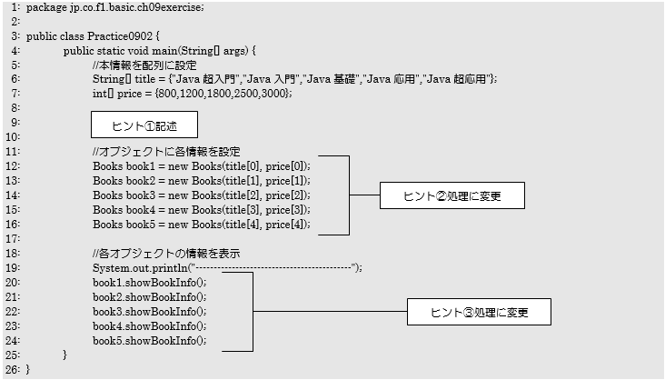 問4 以下に示すPractice0902.javaのソースコードを、Booksオブジェクト配列を利用した内容のPractice0903.javaを作成しなさい。