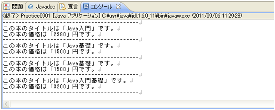 [java] package jp.co.f1.basic.ch09exercise; public class Practice0903 { public static void main(String[] args) { //本情報を配列に設定 String[] title = {“Java超入門”,”Java入門”,”Java基礎”,”Java応用”,”Java超応用”}; int[] price = {800,1200,1800,2500,3000}; //Booksオブジェクト配列を宣言 Books[] bookArray = new Books[5]; //オブジェクトに配列の各情報を設定 for(int i=0;i<bookArray.length;i++){ bookArray[i] = new Books(title[i], price[i]); } //各オブジェクトの情報を表示 System.out.println(“——————————————-“); for(int i=0;i<bookArray.length;i++){ bookArray[i].showBookInfo(); } } } [/java]問5