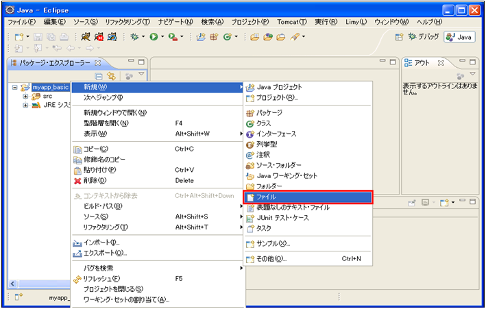 ① ファイルの作成myproj_basicプロジェクト右クリック > 新規 > ファイルを選択