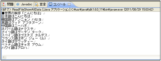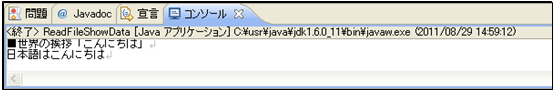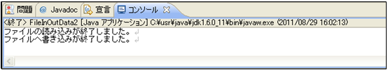 [java] System.out.println(strLine1); System.out.println(strLine2); [/java]実行結果からも分かるように、ファイルの1行目と2行目のデータが正しく表示されています。