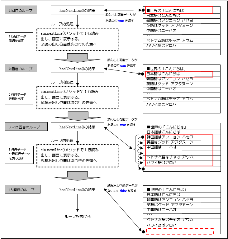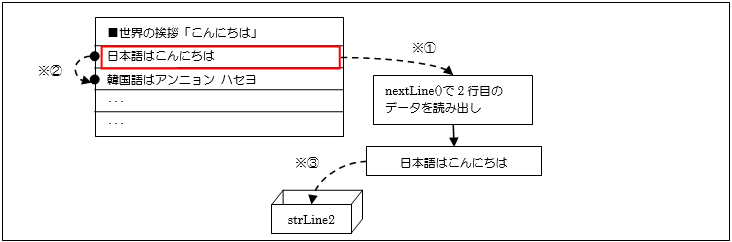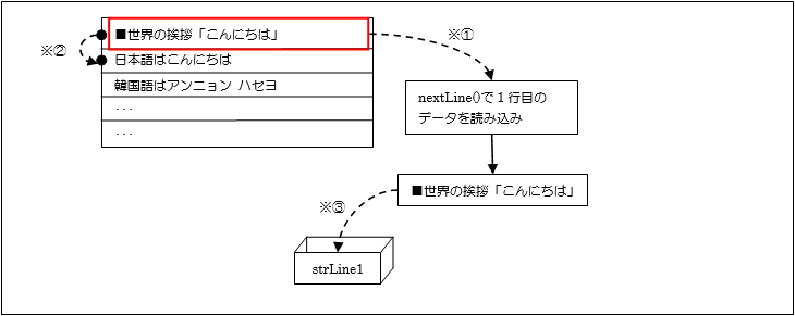 [java] String strLine1 = sin.nextLine(); //1行読み出し [/java]nextLine()メソッドは1行目のデータ(■世界の挨拶「こんにちは」)を取得(※①)して、次の読み出し位置を次の先頭行に設定(※②)します。そして戻り値として取得したデータ(■世界の挨拶「こんにちは」)を返します。(※③)