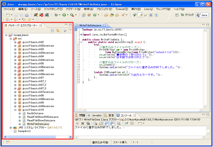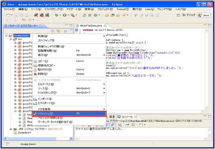 ※プログラムを実行しただけでは書き込みファイル「output1.txt」はEclipse上には表示されません。
