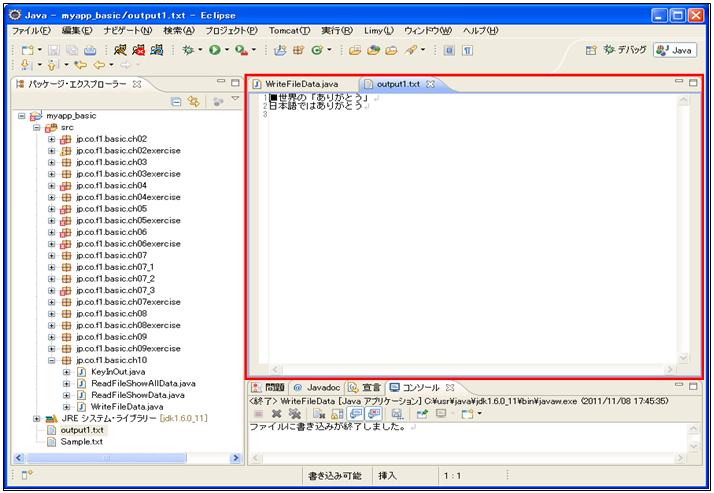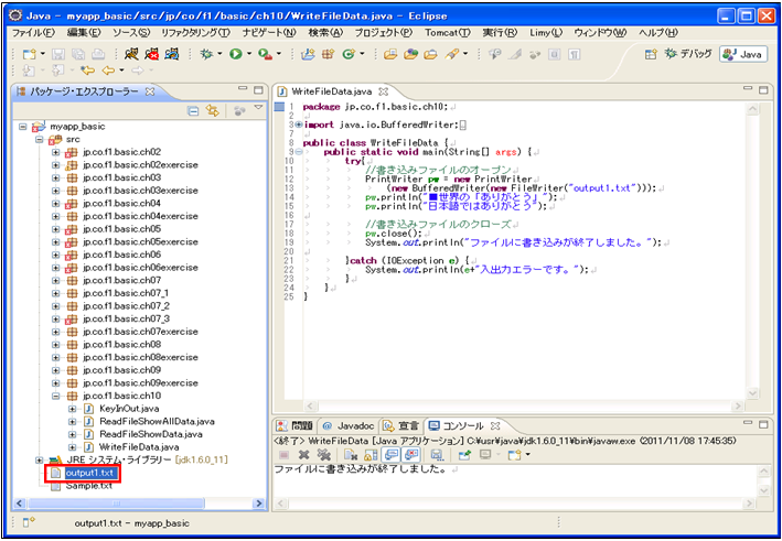 [java] package jp.co.f1.basic.ch10; import java.io.BufferedWriter; import java.io.FileWriter; import java.io.IOException; import java.io.PrintWriter; public class WriteFileData { public static void main(String[] args) { try{ //書き込みファイルのオープン PrintWriter pw = new PrintWriter (new BufferedWriter(new FileWriter("output1.txt"))); pw.println("■世界の「ありがとう」"); pw.println("日本語ではありがとう"); //書き込みファイルのクローズ pw.close(); System.out.println("ファイルに書き込みが終了しました。"); }catch (IOException e) { System.out.println(e+"入出力エラーです。"); } } } [/java] 実行結果① ソース・フォルダー: myproj_basic/src