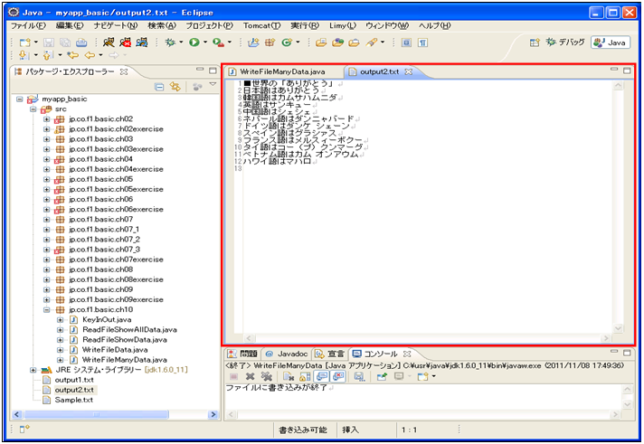 [java] package jp.co.f1.basic.ch10; import java.io.BufferedWriter; import java.io.FileWriter; import java.io.IOException; import java.io.PrintWriter; public class WriteFileManyData { public static void main(String[] args) { //書き込み用データを配列に用意 String[] strArray = {"■世界の「ありがとう」", "日本語はありがとう", "韓国語はカムサハムニダ", "英語はサンキュー", "中国語はシェシェ", "ネパール語はダンニャバード", "ドイツ語はダンケ シェーン", "スペイン語はグラシアス", "フランス語はメルスィーボクー", "タイ語はコー(プ)クンマーグ", "ベトナム語はカム オンアウム", "ハワイ語はマハロ"}; try{ //書き込みファイルのオープン PrintWriter pw = new PrintWriter (new BufferedWriter(new FileWriter("output2.txt"))); //繰り返し処理で書き込みを行う for(int i=0;i<strArray.length;i++){ pw.println(strArray[i]); } //書き込みファイルのクローズ pw.close(); System.out.println("ファイルに書き込みが終了"); }catch (IOException e) { System.out.println(e+"入出力エラーです。"); } } } [/java] 実行結果① ソース・フォルダー: myproj_basic/src