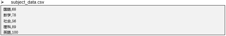 [java] ArrayList<String> subjectList = new ArrayList<String>(); //教科格納用配列 ArrayList<Integer> scoreList = new ArrayList<Integer>(); //点数格納用配列 [/java]17行目ではファイル名「subject_data.csv」を指定して、ファイル入力処理を行っています。