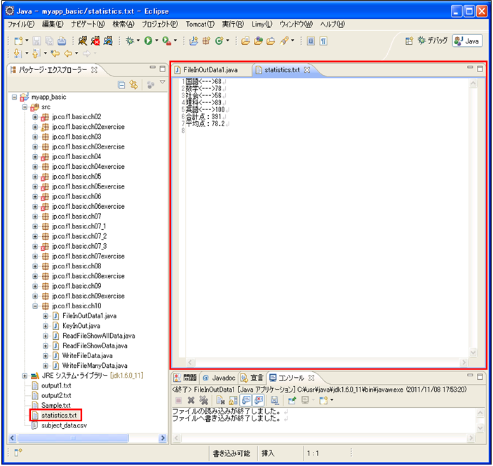 [java] package jp.co.f1.basic.ch10; import java.io.*; import java.util.*; public class FileInOutData1 { public static void main(String[] args) { int sum = 0; // 合計点格納用変数 double ave = 0.0; // 平均点格納用変数 String[] strData = null; // 読み込みデータの分割格納用配列 ArrayList<String> subjectList = new ArrayList<String>(); // 教科格納用配列 ArrayList<Integer> scoreList = new ArrayList<Integer>(); // 点数格納用配列 try { // 教科データファイルの読み込み Scanner sin = new Scanner(new File("subject_data.csv")); // 全データを配列に読み込む while (sin.hasNextLine()) { // 読み込み1行データカンマで分割 strData = sin.nextLine().split(","); // 各配列にデータを格納 subjectList.add(strData[0]); scoreList.add(Integer.parseInt(strData[1])); } // ストリームのクローズ sin.close(); System.out.println("ファイルの読み込みが終了しました。"); // 書き込みファイルのオープン PrintWriter pw = new PrintWriter(new BufferedWriter(new FileWriter( "statistics.txt"))); // 読み込みデータをファイルに書き込む for (int i = 0; i < subjectList.size(); i++) { pw.println(subjectList.get(i) + "<—>" + scoreList.get(i)); } // 合計点を算出しファイルに書き込む for (int i = 0; i < scoreList.size(); i++) { sum += scoreList.get(i); } pw.println("合計点:" + sum); // 平均点を算出しファイルに書き込む ave = (double) sum / scoreList.size(); pw.println("平均点:" + ave); // 書き込みファイルのクローズ pw.close(); System.out.println("ファイルへ書き込みが終了しました。"); } catch (FileNotFoundException e) { System.out.println("入力ファイルが見つかりません。"); } catch (IOException e) { System.out.println(e + "入出力エラーです。"); } } } [/java] 実行結果① ソース・フォルダー: myproj_basic/src