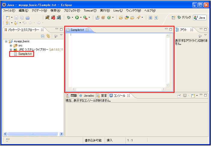 myproj _basicプロジェクト直下に「Sample.txt」ファイルが作成され、そのファイルが開くことを確認する。