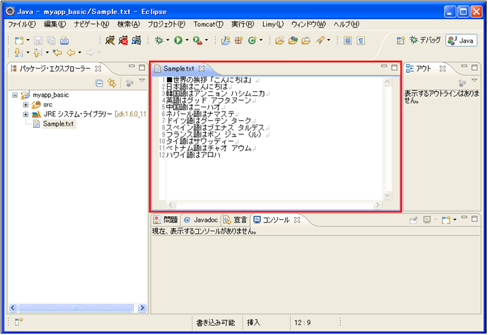 読み込みファイルの準備ファイル入力処理に利用するSample.txtファイルをEclipseの機能を利用して作成します。