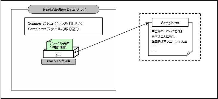 [java] Scanner sin = new Scanner(new File("Sample.txt")); [/java]11行目の処理を行うことでScannerクラス型変数のsinが、ファイル実体の場所情報を指し示すようになります。