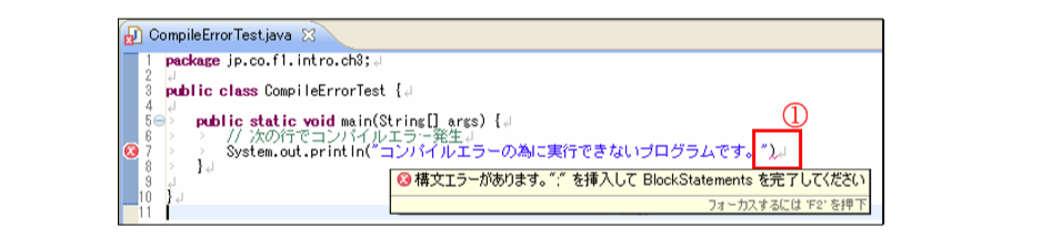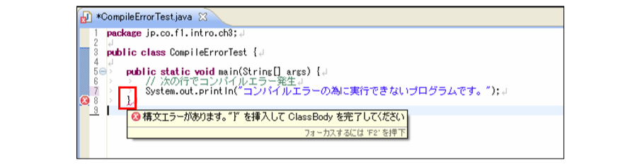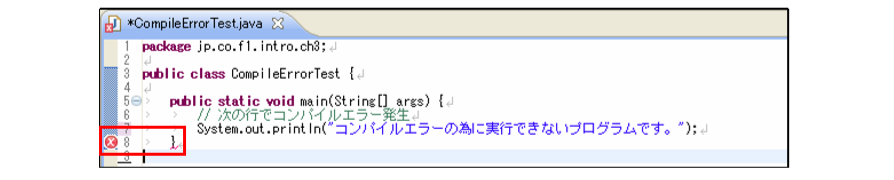 [html] package jp.co.f1.intro.ch3; public class CompileErrorTest { public static void main(String[] args) { // 次の行でコンパイルエラー発生 System.out.println("コンパイルエラーの為に実行できないプログラムです。"); } } [/html]コンパイルエラーは、8行目で発生します。