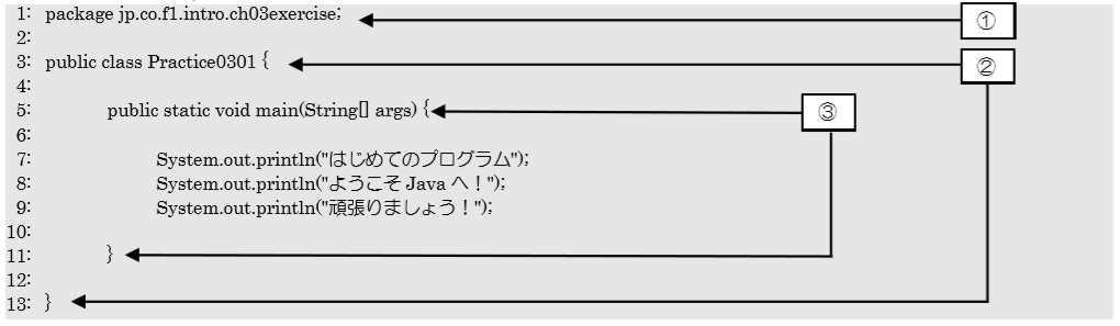 [html] ① jp.co.f1.intro.ch03exercise; public ② Practice0302 { public static void ③ (String[] args) { System.out. ④ (“HelloWorld!”); } } [/html]
