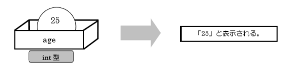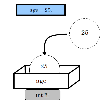 16 行目で、int 型の変数 age を宣言しています。17 行目で、変数 age に 25 を代入しています。図 4.4.9 は、変数 age に 25 が代入されるイメージ図です。
