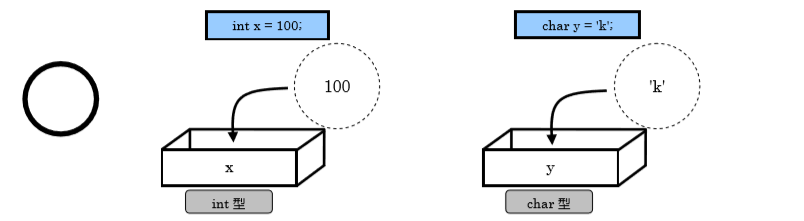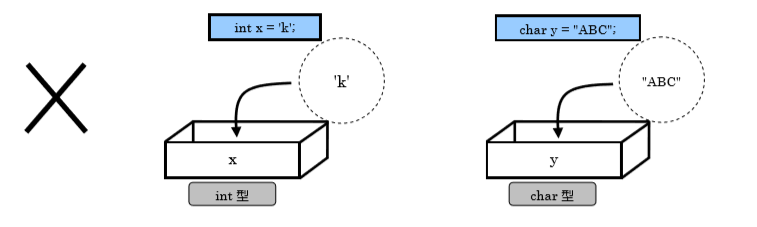 下の図のように、int 型の変数には int 型の値(整数)、char 型の変数にはシングルクォーテーションで囲った 1文字しか入れることができません。