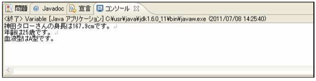 [html] package jp.co.f1.intro.ch4; public class Variable {   public static void main(String[] args) {        //名前を管理する変数     String name;     name = “神田タロー”;          //身長を管理する変数     double height;     height = 167.9;          //年齢を管理する変数     int age;     age = 25;          //血液型を管理する変数     char blood;     blood = ‘A’;          System.out.print(name);     System.out.print(“さんの身長は”);     System.out.print(height);     System.out.println(“cm です。”);          System.out.print(“年齢は”);     System.out.print(age);     System.out.println(“歳です。”);          System.out.print(“血液型は”);     System.out.print(blood);     System.out.print(“型です。”);       } } [/html]
