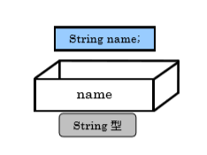 8 行目で String 型の変数 name を宣言します。この時のイメージは図 4.4.6 になります。9 行目では、宣言した変数 name に「神田タロー」という文字列の値を代入しています。