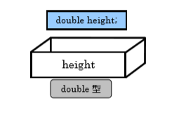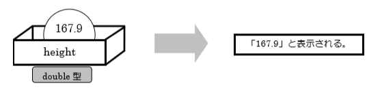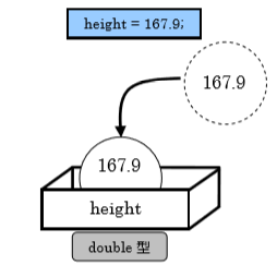 12 行目では、double 型の変数 height を宣言します。そして、13 行目で変数 height に 167.9 という値を代入しています。12 行目のイメージは図 4.4.7、13 行目は図 4.4.8 になります。