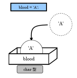 20 行目は、char 型の変数 blood を宣言しています。21 行目では変数 blood に文字’A’を代入しています。この時のイメージは図 4.4.10 になります。