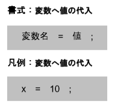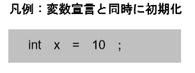 例えば、int 型の変数 x を宣言し、同時に 10 を代入する場合は以下のようになります。