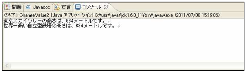 [html] package jp.co.f1.intro.ch4; public class ChangeValue2 { public static void main(String[] args) { //東京スカイツリーの高さを管理する変数 int tokyoSkyTree; tokyoSkyTree = 634; System.out.print(“東京スカイツリーの高さは、”); System.out.print(tokyoSkyTree); System.out.println(“メートルです。”); //世界一の塔の高さを管理する変数 int highestTower; highestTower = tokyoSkyTree; System.out.print(“世界一高い自立型鉄塔の高さは、”); System.out.print(highestTower); System.out.println(“メートルです。”); } } [/html]実行結果