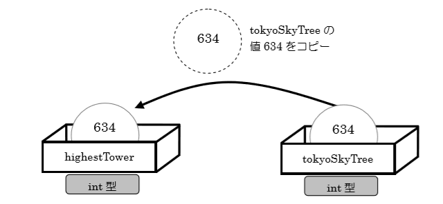 17 行目で変数 highestTower に変数 tokyoSkyTree を代入しています。つまり、変数 highestTower に変数tokyoSkyTree の値をコピーしているとも言えます。