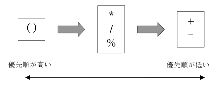 算術演算子を使った四則演算にも計算の優先順位があります。優先順位の考え方は、算数の場合と同じです。