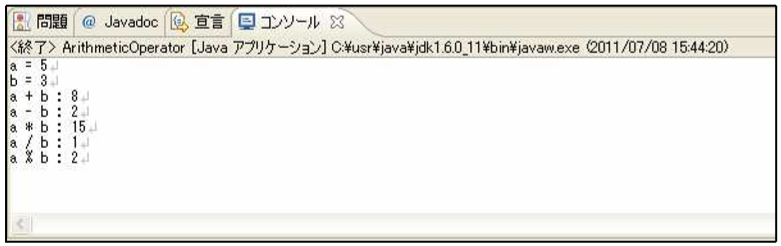 [html] package jp.co.f1.intro.ch5; public class ArithmeticOperator {    public static void main(String[] args) {       //計算用の値を管理する変数を宣言し、値を代入       int a = 5;       int b = 3;       //回答を管理する変数       int answer;              System.out.print(“a = “);       System.out.println(a);       System.out.print(“b = “);       System.out.println(b);       //足し算       answer = a + b;       System.out.print(“a + b : “);       System.out.println(answer);       //引き算       answer = a – b;       System.out.print(“a – b : “);       System.out.println(answer);              //掛け算       answer = a * b;       System.out.print(“a * b : “);       System.out.println(answer);       //割り算       answer = a / b;       System.out.print(“a / b : “);       System.out.println(answer);       //余りを求める       answer = a % b;       System.out.print(“a % b : “);       System.out.println(answer);    } } [/html]