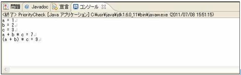 [html] package jp.co.f1.intro.ch5; public class PriorityCheck {     public static void main(String[] args) {        //計算用の値を管理する変数を宣言し、値を代入        int a = 1;        int b = 2;        int c = 3;        //回答を管理する変数を宣言        int answer;        System.out.print(“a = “);        System.out.println(a);        System.out.print(“b = “);        System.out.println(b);        System.out.print(“c = “);        System.out.println(c);        answer = a + b * c;        System.out.print(“a + b * c = “);        System.out.println(answer);        answer = (a + b) * c;        System.out.print(“(a + b) * c = “);        System.out.println(answer);    } } [/html]