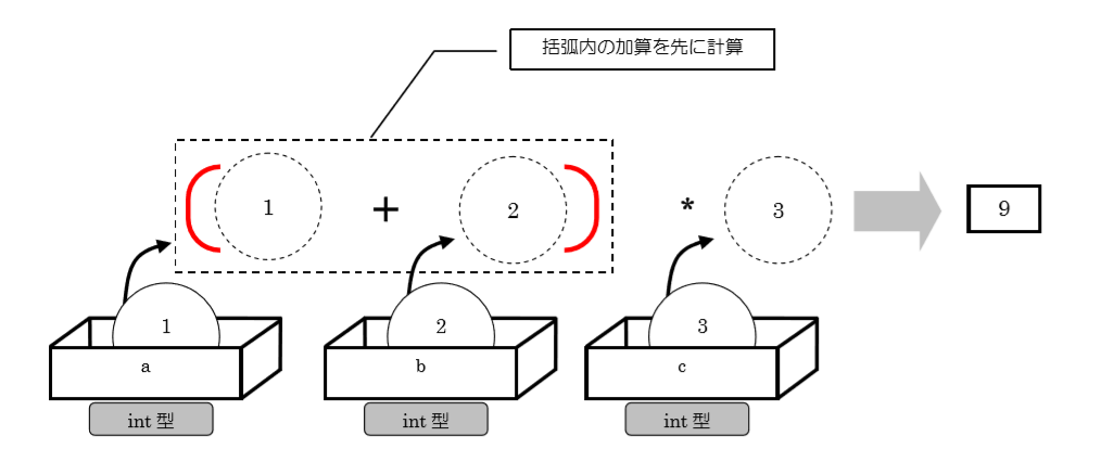 28 行目では、先ほどの 24 行目の計算の加算部分に括弧を付けて、その計算結果を変数 answer に代入しています。括弧を付けたことによって、加算が先に計算されるので、答えは「9」になります。