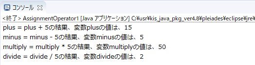 [html] package jp.co.f1.intro.ch5; public class AssignmentOperator1 {     public static void main(String[] args) {        //加算用の値を管理する変数        int plus = 10;        plus = plus + 5;        System.out.print(“plus = plus + 5 の結果、変数 plus の値は、”);        System.out.println(plus);        //減算用の値を管理する変数        int minus = 10;        minus = minus – 5;        System.out.print(“minus = minus – 5 の結果、変数 minus の値は、”);        System.out.println(minus);        //乗算用の値を管理する変数        int multiply = 10;        multiply = multiply * 5;        System.out.print(“multiply = multiply * 5 の結果、変数 multiply の値は、”);        System.out.println(multiply);        //除算用の値を管理する変数        int divide = 10;        divide = divide / 5;        System.out.print(“divide = divide / 5 の結果、変数 divide の値は、”);        System.out.println(divide);     } } [/html]
