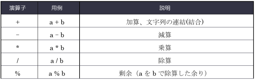 プログラムの演算に使用する記号のことを算術演算子と呼びますが、プログラミングで使用するもっとも基本的な算術演算子を下の表 5.1.1 に示しています。