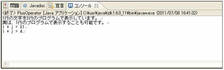 [html] package jp.co.f1.intro.ch5; public class PlusOperator { public static void main(String[] args) { int i = 3; int j = 1; //文字列連結を使用せずに表示 System.out.print(“1 行の文字を”); System.out.print(i); System.out.println(“行のプログラムで表示しています。”); //文字列連結を使用して表示 System.out.println(“実は、” + j + “行のプログラムで表示することも可能です。”); //文字列連結と計算の順序を確認 System.out.println(“i + j = ” + i + j); System.out.println(“i + j = ” + (i + j)); } } [/html]実行結果