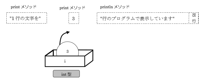 これまでは、11~13 行目までのように、print メソッドと println メソッドを使って複数行で 1 行の文字を表示させていました。